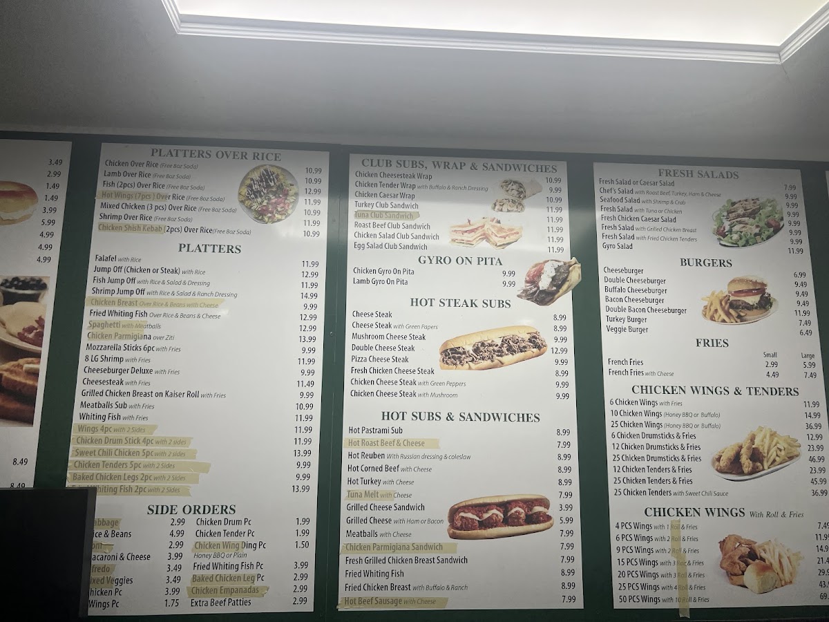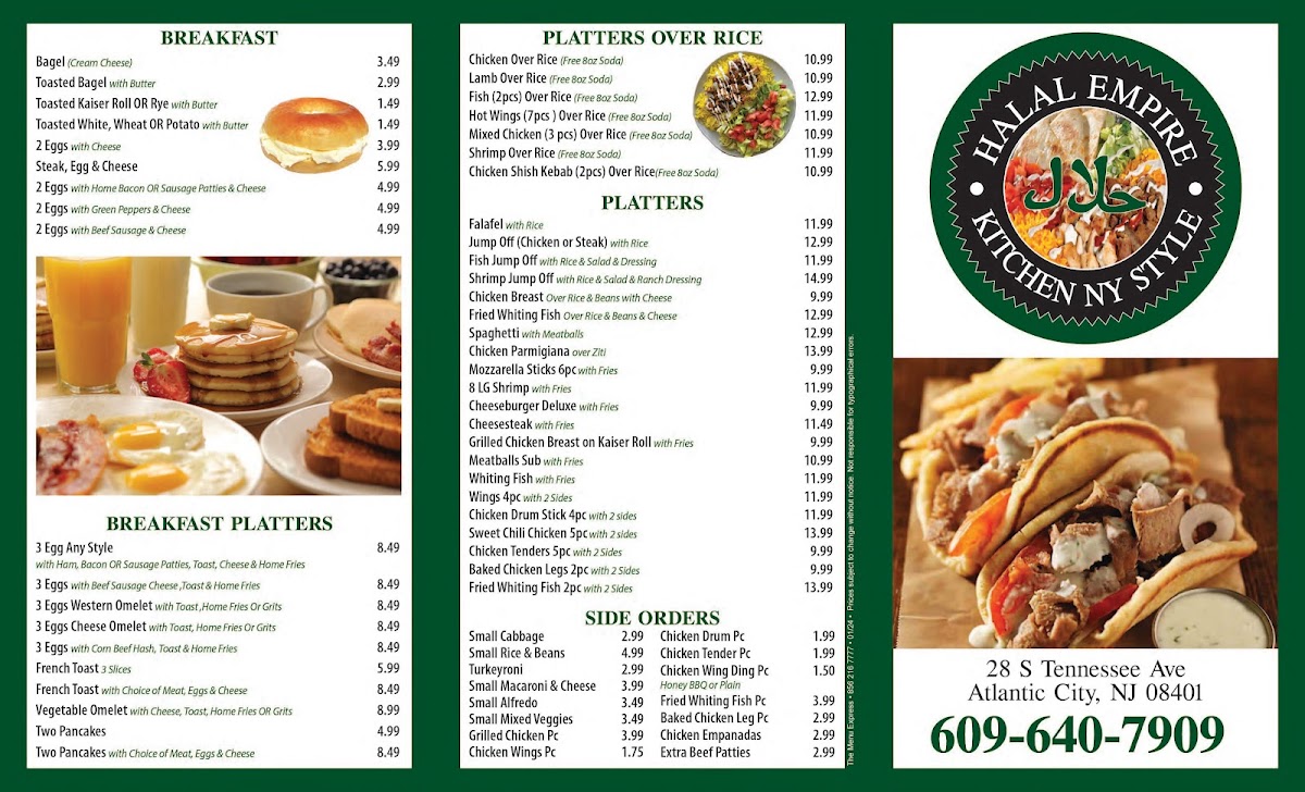 From a reviewer’s perspective, the menu at Halal Empire Kitchen brings together a small but satisfying selection of comfort-driven favorites, each clearly reflecting the kitchen’s focus on straightforward, well-seasoned halal fare. The French Fries (Large) make for a simple, crowd-pleasing start-crispy, generously portioned, and ideal as a snack or side. Among the hot subs and sandwiches, the Fried Whiting Fish stands out with its flaky texture and freshly fried crunch. For something heartier, the platters section offers dependable staples like Chicken Over Rice and Shrimp Over Rice, both classic choices for anyone craving a balanced meal of protein, spiced rice, and plentiful toppings. The hot steak subs include a familiar favorite, the Cheese Steak, which adds a savory, comforting option to the lineup. To round things out, the Seafood Salad from the cold sides provides a refreshing contrast to the heavier dishes. Altogether, the menu may be concise, but each item delivers a clear sense of flavor and value, making it easy for diners to find something satisfying without feeling overwhelmed by too many choices.